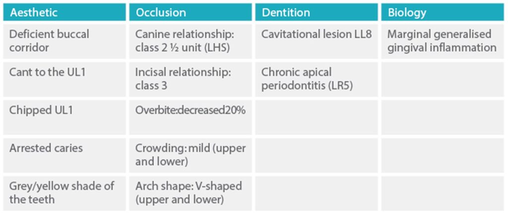 The results of the extraoral and intraoral examinations are summarised in a problem list (Table 1). Based on this list, an interdisciplinary approach helped to define all the potential treatment goals.