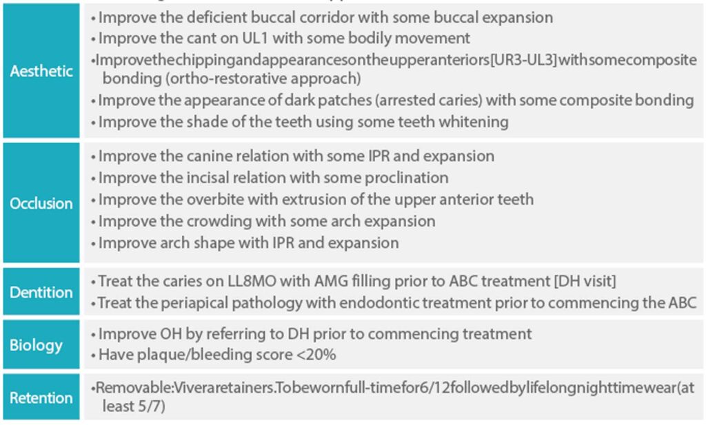 The scope of the treatment goals achievable were presented to the patient with advantages and disadvantages of the alternative treatment plans. The treatment goals (listed in Table 2) were agreed and defined.